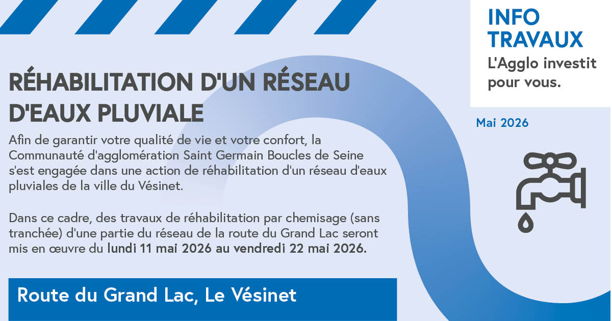 Afin de garantir votre qualité de vie et votre confort, la Communauté d’agglomération Saint Germain Boucles de Seine s’est engagée dans une action de réhabilitation d’un réseau d’eaux pluviales de la ville du Vésinet.