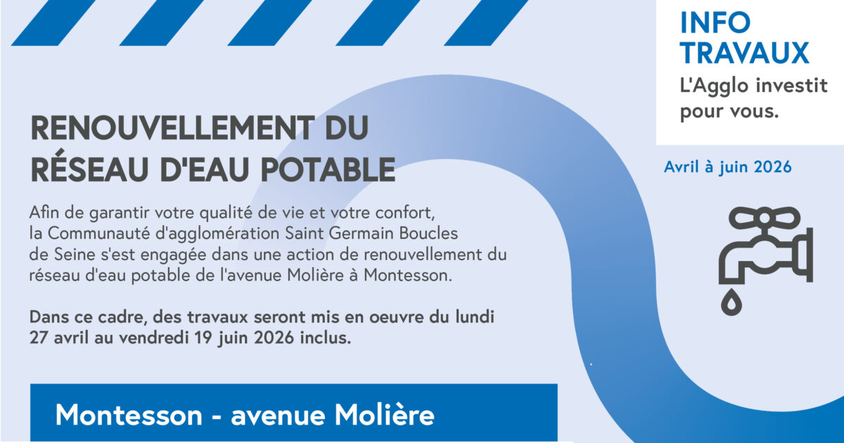 Afin de garantir votre qualité de vie et votre confort, la Communauté d’agglomération Saint Germain Boucles de Seine s’est engagée dans une action de renouvellement du réseau d’eau potable de l’avenue Molière à Montesson.