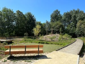 Les coupes des arbres nécessaires à la réalisation des cheminements ont été réutilisées sur le projet. Plusieurs troncs d’arbres servent maintenant de banc : économique et écologique ! Parfait pour admirer la mare forestière et le bras mort !