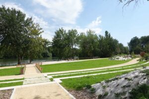 - Le dernier secteur, accessible depuis la rue de la Pâture et situé dans le prolongement du parc Nelson Mandela, offre un parcours sportif et des espaces de détente. Autour du pont de Bezons, des retenues de terre en gabions viennent créer un amphithéâtre de verdure avec de larges gradins face à la Seine.